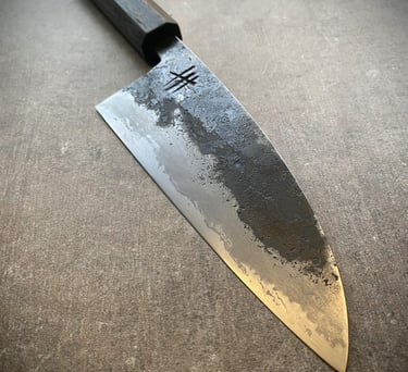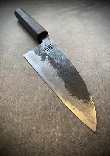 Mehrlagige Konstruktionen wie sanmai (Dreilagen), bei denen Außenseiten aus recyceltem Eisen oder Stahl mit einer Schneidlage aus hochwertigem Kohlenstoffstahl miteinander feuerverscheißt werden sind in mein Hauptfokus. Neben diesen stelle ich auch immer wieder Monostahlklingen her.